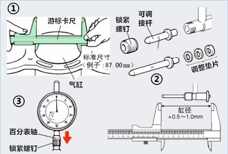 ①用游标卡尺测量缸径获得缸径的基本尺寸或直接从维修手册中查找气缸的标准缸径。