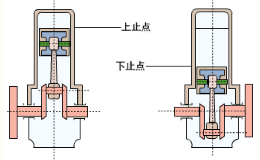 活塞顶离曲轴回转中心最远处为上止点;活塞顶离曲轴回转中心最近处为下止点。在上、下止点处,活塞的运动速度为零。