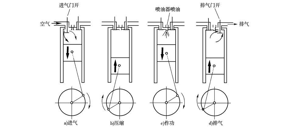 四冲程柴油机(压燃式发动机)的每个工作循环也经历进气、压缩、做功、排气四个行程。但由于柴油机的燃料是柴油,其黏度比汽油大,而其自燃温度却较汽油低,故可燃混合气的形成及点火方式都与汽油机不同。