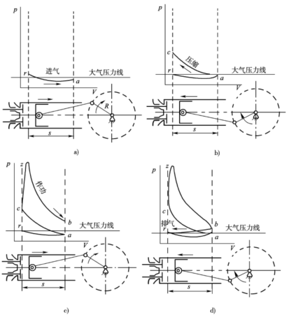 在图1-1-21 a)示功图上,进气行程用曲线ra表示。曲线ra位于大气压力线下,它与大气压力线纵坐标之差即表示气缸内的真空度。