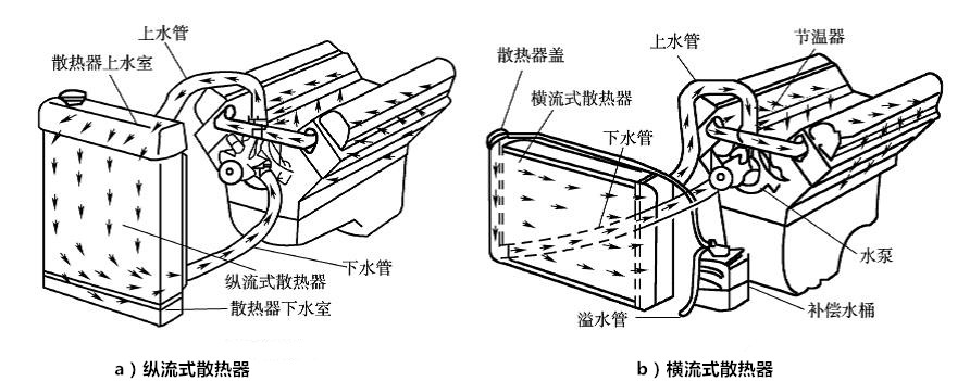 ①纵流式:热冷却液由上水室流入散热器,冷却过的冷却液由下水室流出,通过下水管由水泵再泵入水套循环。因能配合水温与相对密度的变化,冷却效果好,多被车用发动机采用,如图2-2-1 a)所示。