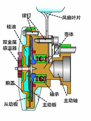 硅油风扇离合器前端盖上有一双金属片感温器,能根据温度变化产生扭转,通过传动销转动离合器内部的阀片,控制硅油的流动以改变离合器的接合力。当发动机温度较低时,双金属片卷簧使风扇离合器处于半分离状态,这时风扇随同离合器壳体一起在主动轴上空转打滑,转速很低。当发动机升温后,双金属片卷簧会使离合器的接合力随温度的升高而逐渐加大,风扇叶片的打滑程度逐渐减小,转速得到提高以适应发动机增强冷却的需要。