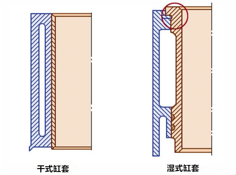 将气缸制造成单独的圆筒形零件(即气缸套),然后镶嵌装入气缸体内。气缸套采用优质耐磨材料制成,气缸体则可用价格较低的一般材料制造,从而降低了制造成本。同时,气缸套可以从气缸体中取出,因而便于修理和更换,并可大大延长气缸体的使用寿命。气缸套有干式气缸套和湿式气缸套两种,如图4-2-4。