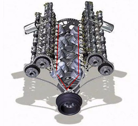 所有气缸分为两列,成一定夹角布置,侧面看呈V字型,如图4-2-6所示。发动机运转时震动、噪音较小,在布置相同数量气缸条件下,发动机总长度小,因而利于布局多气缸发动机,但构造较复杂,维护成本高。