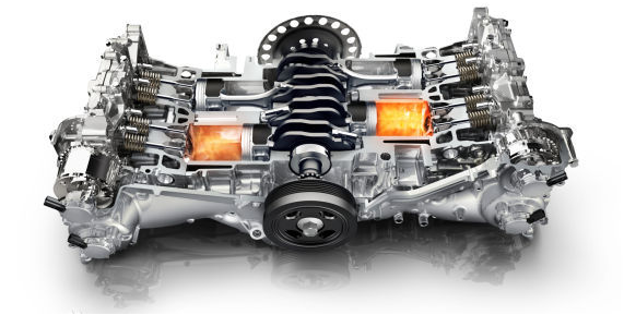 两列气缸呈180度水平相接,活塞做水平的往复运动,如图4-2-7所示。重心低、操控极佳,行驶稳定性好,但制造成本高,制造难度大,后期维护成本高。