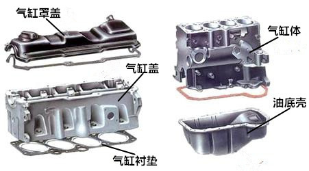 气缸体和上曲轴箱一般采用灰铸铁、球墨铸铁或合金铸铁铸造而成。有些发动机为了减轻质量、加强散热而采用铝合金缸体。