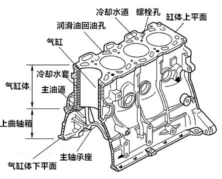 气缸体上半部有若干个为活塞在其中运动导向的圆柱形空腔,称为气缸。下半部为支撑曲轴的曲轴箱,其内腔为曲轴旋转的空间。侧壁上铸有主油道,前后壁和中间隔板上钻有分油道。