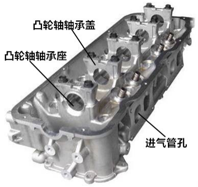 顶置凸轮轴式发动机的气缸盖上还加工有凸轮轴轴承孔,用以安装凸轮轴,如图4-4-3所示。