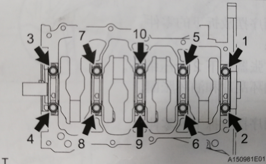 注意事项:将轴瓦与主轴承盖作为一个组件保存,同时按正确的顺序摆放主轴承盖,否则会破坏轴承间隙。
