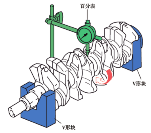 检验弯曲变形应以两端主轴颈的公共轴线为基准,检查中间主轴颈的径向圆跳动误差。