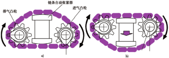 可变正时链条张紧器布置在进气凸轮轴和排气凸轮轴之间的链条张紧机构内。在这种机构中,发动机曲轴的正时链轮只通过正时链条驱动排气凸轮轴,进气凸轮轴则由排气凸轮轴通过另一根链条驱动,如图4-9-2a)所示。该链条的长度比正常的长度要长几节,并用自动链条张紧器保持张紧,如图4-9-2b)所示。该张紧器在使链条保持张紧状态的同时,还可以在压力机油的控制下作整体的上下移动,使进、排气凸轮轴之间两侧链条的长度发生变化,以改变两凸轮轴之间的相对角度,从而达到使进气凸轮轴的配气相位角发生变化的目的,如图4-9-3所示。这种可变气门驱动机构结构简单,成本低,但只能在1个凸轮轴上(通常为进气凸轮轴)实现配气相位的变化,而且变化的角度范围较为有限。