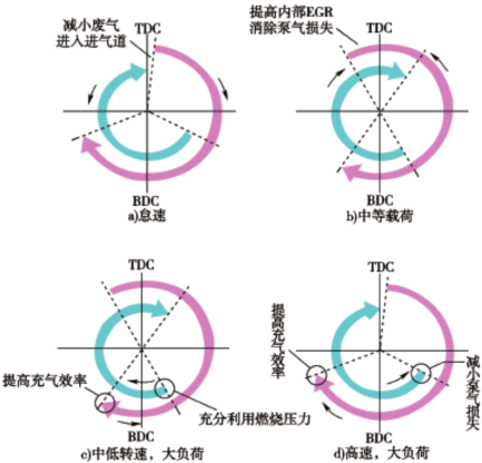 中小负荷时,增大进气提前角和排气迟后角,以增大气门叠开角,产生缸内废气再循环(这种设计可以取消EGR装置),降低排放污染,并减小排气行程后期和进气行程早期的泵气损失,如图4-9-1 b)所示。