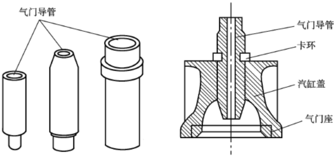 导管内、外圆柱面经加工后压入气缸盖的气门导管孔中,然后再精铰内孔。为了防止气门导管在使用过程中松脱,有的发动机对气门导管用卡环定位。气门杆与气门导管之间一般留有0.05~0.12mm间隙,使气门杆能在导管中自由运动。