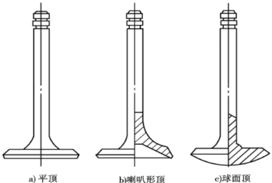气门头部的形状有平顶、球面顶和喇叭形顶(凹顶)等,如图4-11-1所示。目前使用最多的是平顶气门头。平顶气门头(图4-11-1 a))结构简单,制造方便,吸热面积小,质量也小,进、排气门都可以采用。球面顶气门头(图4-11-1 c))使用于排气门,因为其强度高,排气阻力小,废气的清除效果好。但球形的受热面积大,质量和惯性力大,加工较复杂。喇叭形顶头部(图4-11-1 b))与杆部的过渡部分具有一定的流线形,可以减少进气阻力,但其顶部受热面积大,故适用于进气门,而不宜用于排气门。