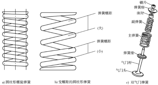 气门弹簧一般采用圆柱形螺旋弹簧,如图4-11-7所示,为了防止弹簧发生共振,可采用变螺距圆柱弹簧。现代高速发动机多采用同心安装的内外两根气门弹簧,这样既提高了气门弹簧工作的可靠性,又能有效地防止共振的发生,安装时,内外弹簧的螺旋方向应相反,以防止折断的弹簧圈卡入另一个弹簧座圈。