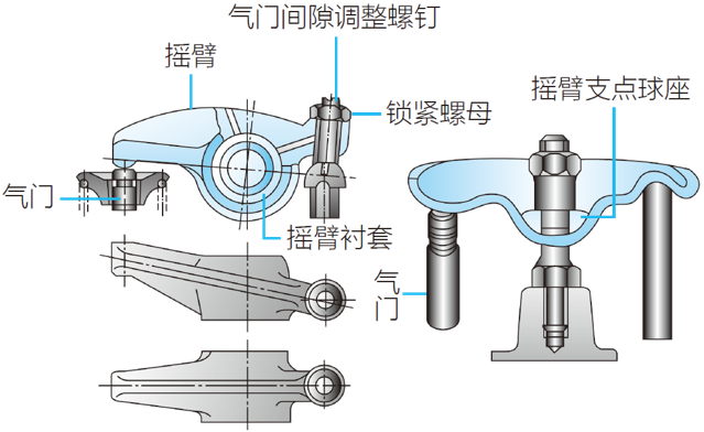 摇臂的作用是将推杆和凸轮传来的运动和作用力,改变方向后传给气门使其开启。摇臂主要由 锻钢、可锻铸球、球墨铸铁或铝合金制造。