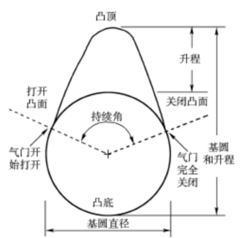 同一缸的进排气凸轮称为异名凸轮。四冲程发动机的排气行程和进气行程是两个相连的行程,如果气门不早开晚关,从排气门开启到进气门开启,刚好是一个行程,曲轴转过180°,反映到凸轮轴上两异名凸轮之间的夹角为90°。由于气门是早开晚关的,所以两异名凸轮间的夹角大于90°。