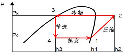 此处制冷剂由液态不断的蒸发为气态,是气液混合状态。由制冷剂同处于蒸发器内,压力不变,但制冷剂对外界吸热,由此比焓增加。从4点回到1点的过程是制冷剂由液态完全气化成气态的过程,也是吸热的过程。