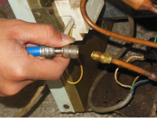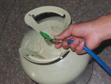 用连接管将焊在工艺管上的修理阀和制冷剂钢瓶连接排空气后加入制冷剂,一般有两个步骤: