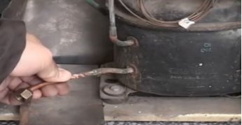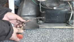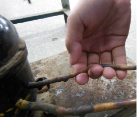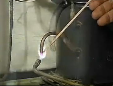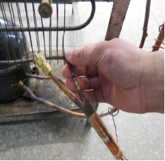 这个步骤是必须的,我们先用割管器从压缩机的工艺管处割开,然后让内部的制冷剂自然放掉,只有等到制冷剂全部放完以后才能动火焊接。