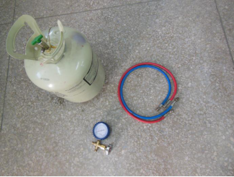 (1)在充注前首先要准备好制冷剂钢瓶、三通检修表阀、连接软管待,如图10-25所示。