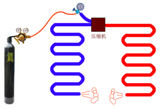 (4)如系统中有水分则要充一些氮气进入到系统内,然后让压缩机运转半个小时,然后再抽真空,如此反复两到三次。