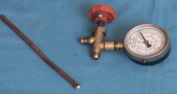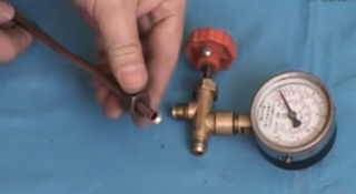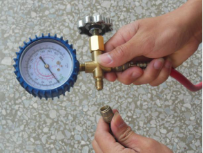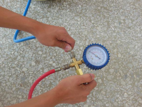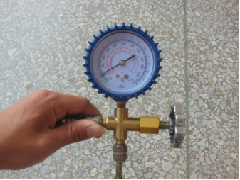 在维修制冷设备的过程中经常使用三通修理表阀,可用来实现抽真空、充注制冷剂等操作,并通过检修表阀上的压力表测量制冷管路的压力,来判断制冷剂的多少。