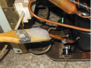 ②用刷子蘸取洗洁精水,并涂抹至管路可能泄露的焊接周围,如图10-9所示。仔细观察管路周围是否有气泡出现。如果管路上没有气泡出现,就证明管路良好,无泄露现象;这样反复操作,直到焊封处在检漏时不再出现气泡为止。