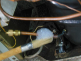 (2)对制冷剂的排放问题,由R600a性质决定系统内制冷剂充注量比R12、R134a电冰箱少,系统平衡压力也比R12、R134a电冰箱低,且R600a易燃易爆,因此,排放制冷剂时应按以下步骤进行。