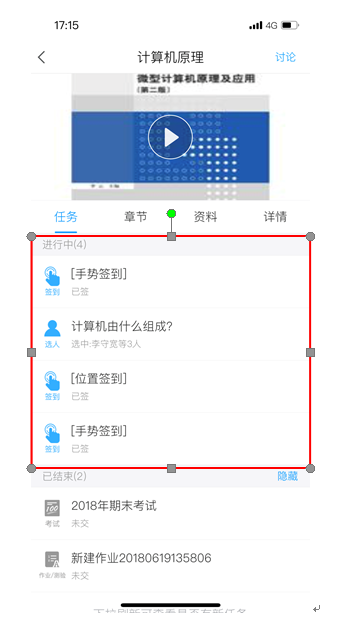 学生在课程页面中,点击任务,查看教师发布的任务内容,完成签到、抢答、问卷回答等内容。该操作也可以在超星学习通中查看并完成。如下图所示: