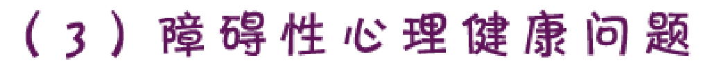 障碍性心理问题有时候也称为“心理障碍”、“心理疾病”。是变态心理学、临床心理学、健康心理学、生理心理学、犯罪心理学、咨询心理学等心理学科研究的范畴。其特征:一是个体持久地感受到痛苦(一般以6个月为界线);二是社会功能受损,表现为人际关系糟糕,容易产生对抗甚至敌对行为;三是表现出非当地文化类型的特殊行为。