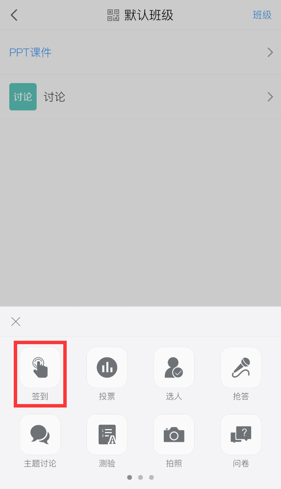 进入课程——班级后,点击下方“+”号按钮,点击“签到”,选择签到方式。