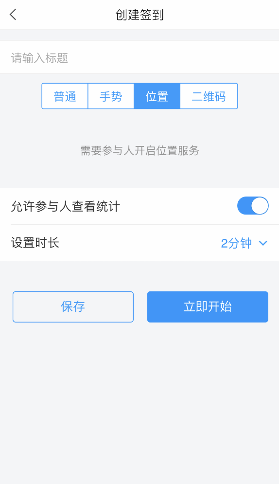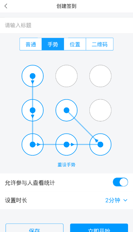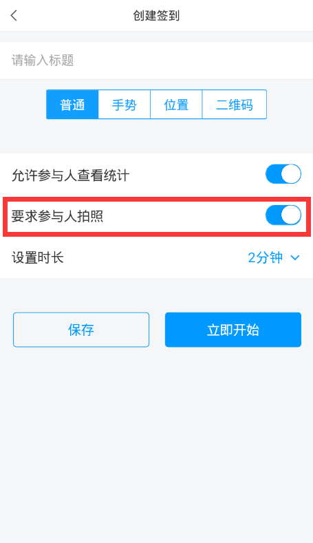 1.“普通签到” ,可开启“要求参与人拍照”,设定签到时长;可选择“保存”,之后发布,也可以“立即开始”。所有课堂活动均可课前备课保存,课上一键开始。如第2图,保存时,弹出“设置”窗口,指的是将此活动保存于哪个分组中,如第3图。