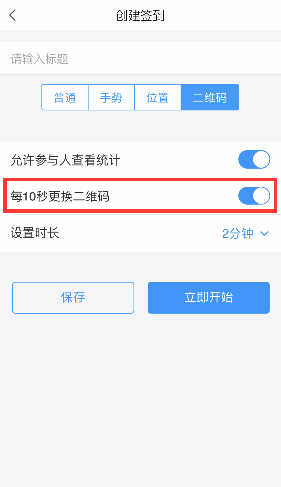 4.“二维码签到”,开启“每10秒更换二维码”,设定签到时长。
