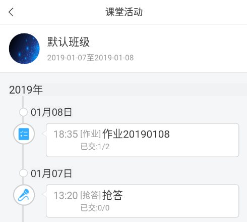 统计页面,顶部可进行班级切换;下设课堂报告统计、学情统计、成绩统计三大板块。