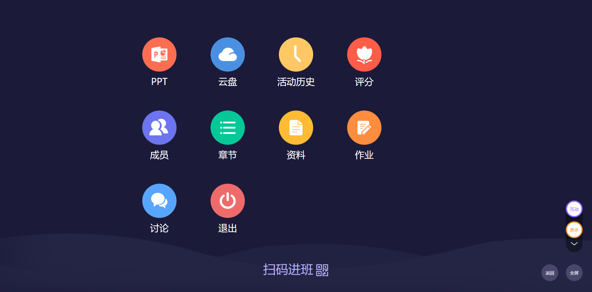电脑投屏页面上,点击右侧“互动”按钮,可在电脑端发布部分课堂活动。点击“更多”: