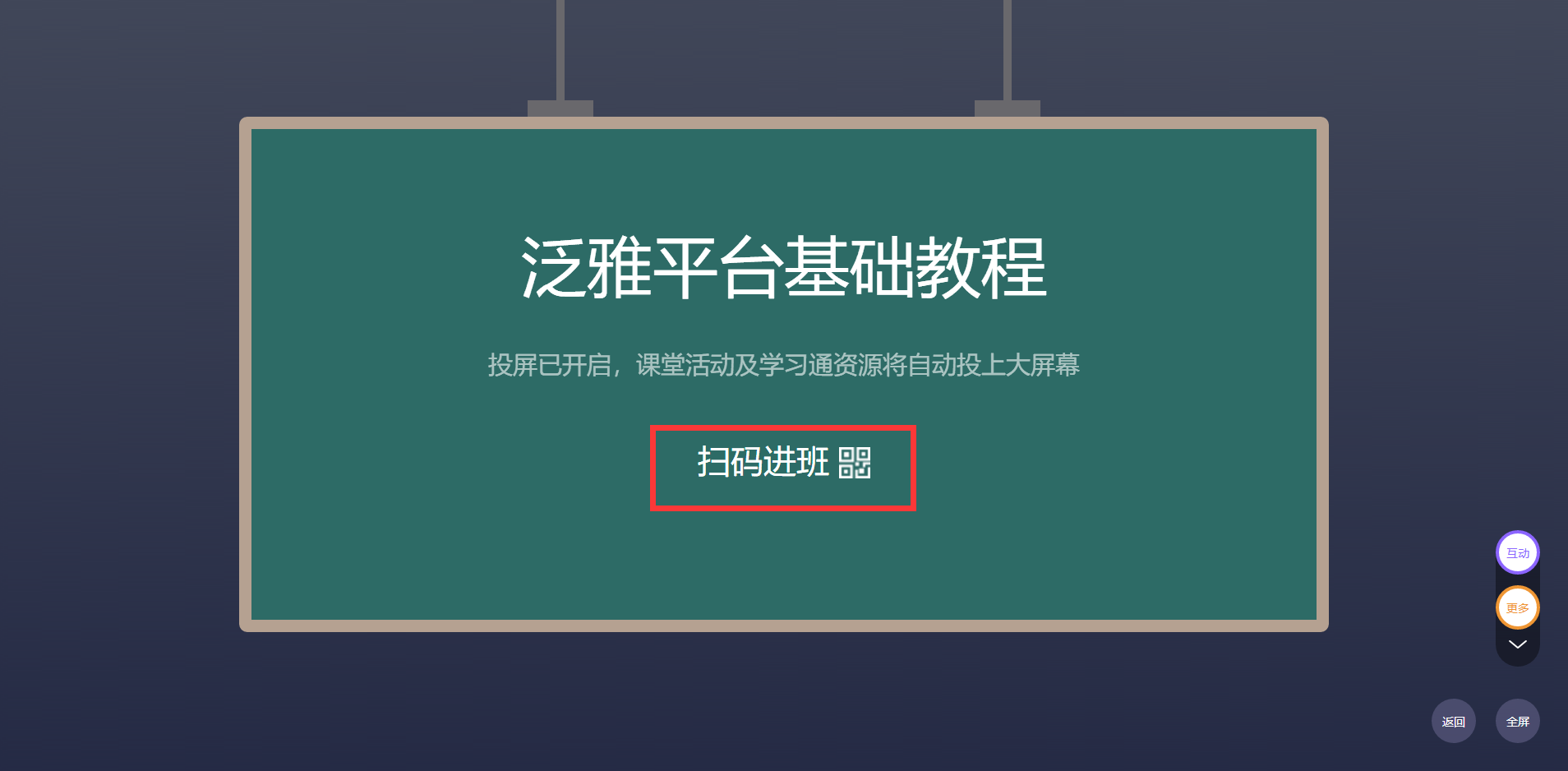 电脑投屏页面上,课程名称下方,点击“扫码进班”,即可打开“班级邀请码”或“微信扫码进班”(“微信扫码进班”可用于会议、活动等)。