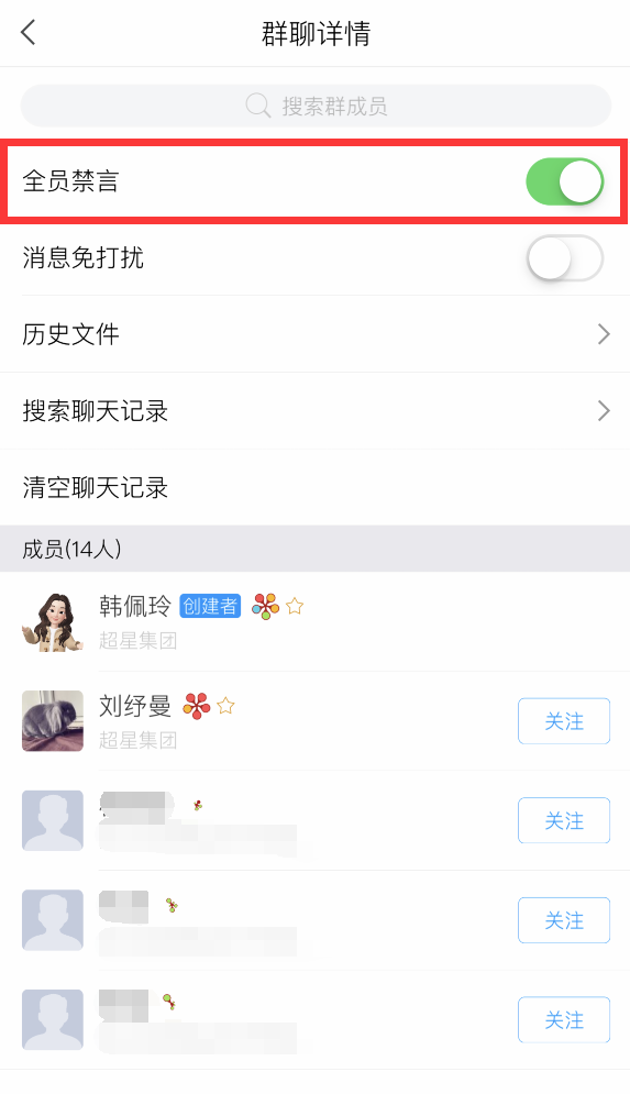 2.“班级群聊”,可查看教师发布的“任务”,及推送教学资源;进入班级群聊后,右上角三个圆点图标中,可开启全员禁言。