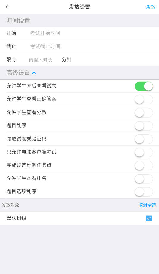 创建完成的试卷会保存在试卷库中,教师可直接点击发布进行试卷发布设置,并点击发放。