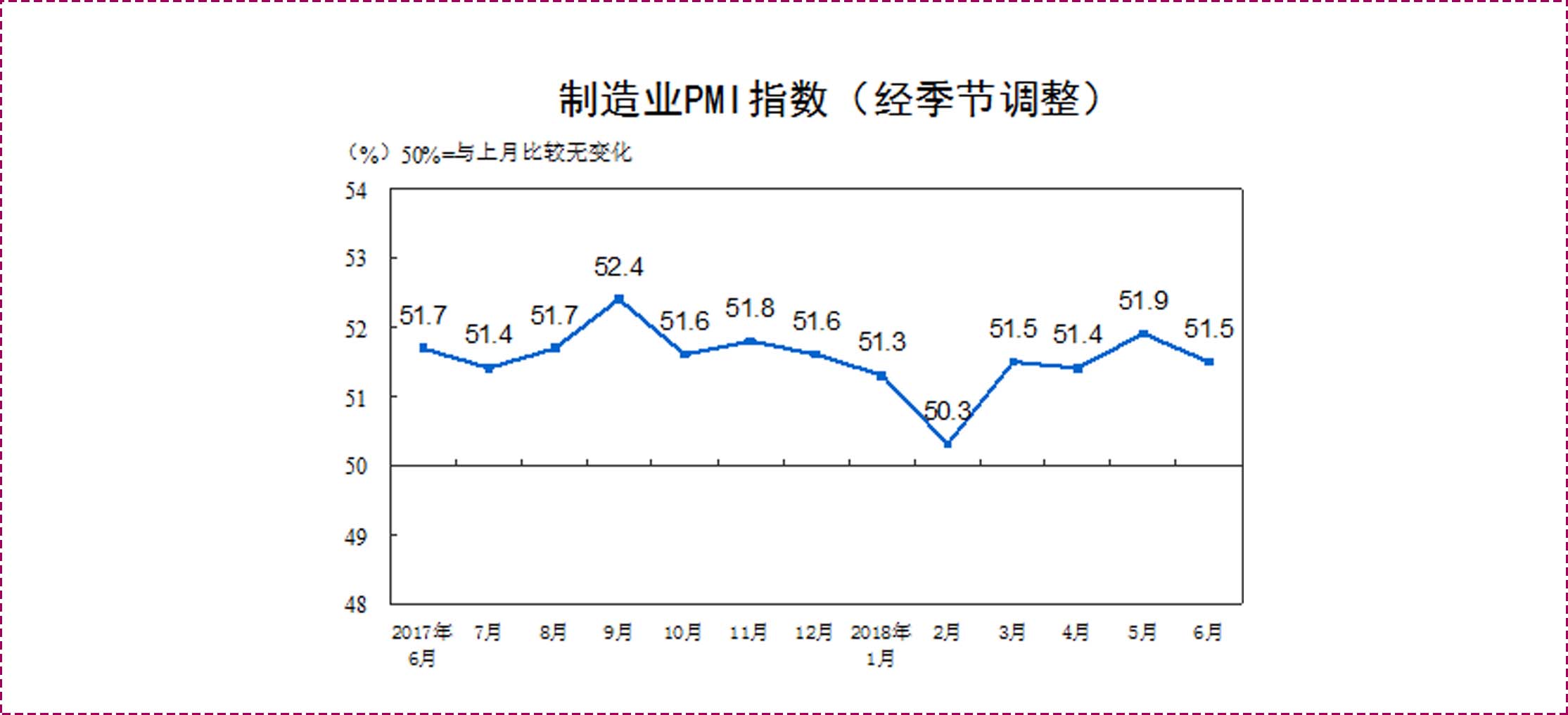 2018年6月份,中国制造业采购经理指数(PMI)为51.5%,比上月回落0.4个百分点,仍高于上半年均值0.2个百分点,制造业总体继续保持扩张态势。
