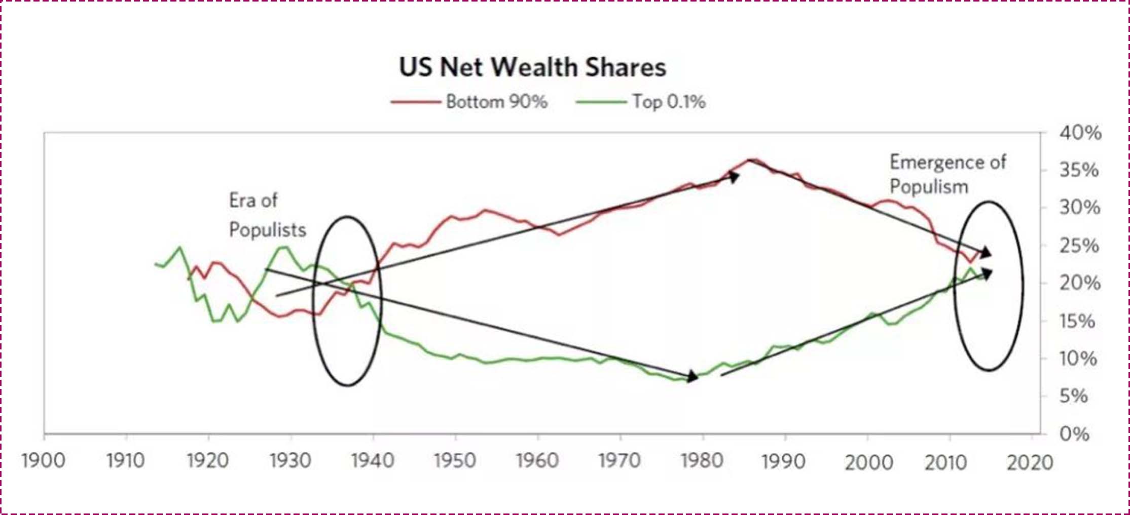 自从1980年开始的全球化之后,美国收入最高的前0.1%人群财富占比大幅提高,而美国收入最低的后90%人口财富占比大幅下滑。按照这个速度,到了2020年美国收入最高前0.1%人群的财富量要超过收入最低后90%人群。