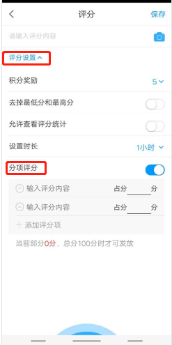 2.设置积分奖励,设置去掉最高分最低分,设置允许学生查看评分统计,评分时长,分项评分,设置评分内容,设置完成点击发起评分。