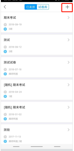 点击右上角加号创建考试,试卷可以直接从电脑端已创建的题库进行选题。
