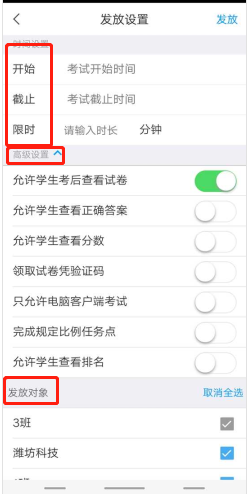 创建完成的试卷会保存在试卷库中,教师可直接点击发布进行试卷发布设置,并点击发放