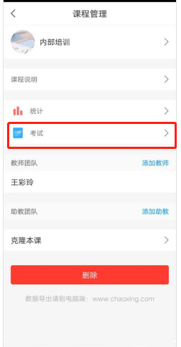 打开课程,点击右上角管理,考试。