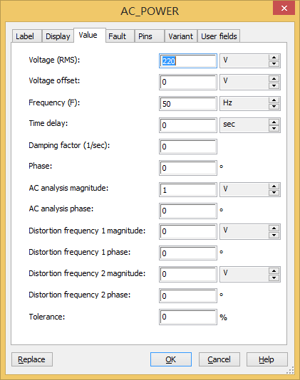 ² 放置交流电源后,默认为120V、60Hz的正弦交流电源,双击元件,弹出“AC_POWER”属性对话框,如图5.4。