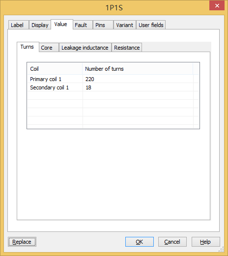 ² 放置完后,也可双击元件,弹出“1P1S”属性对话框,如图5.6所示。修改“Value”选项卡里的“Turns”选项卡中设定变压比为220:18。