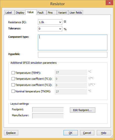 ² 放置电阻后,也可双击元件,弹出“Resistor”属性对话框,如图5.8,可个性相应的电阻值或其它属性。