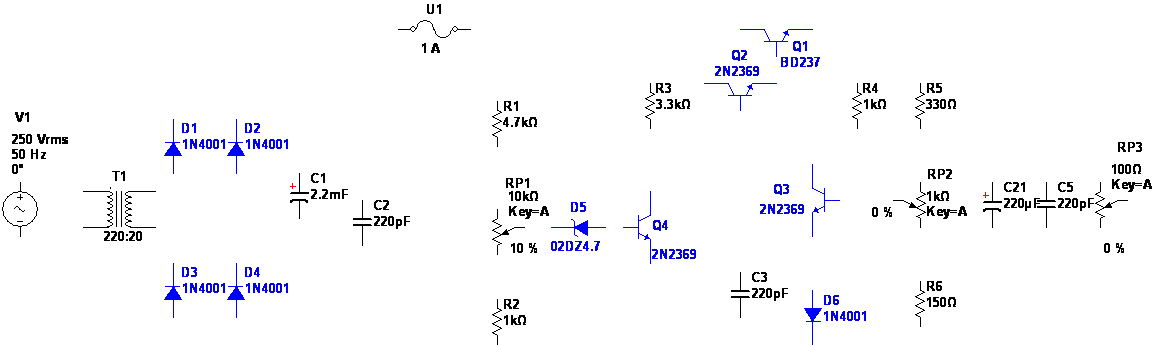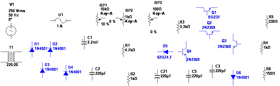 按照项目三所设计的串联直流稳压电源,利用仿真软件进行仿真测试,看是否满足设计需求。详见步骤如下: