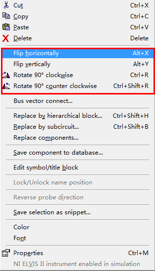 放置后的元件都按照默认的横着摆放的在编辑窗口中。实际在绘制电路过程中,各种元件的摆放情况是不一样的,比如想把电阻R1变成竖直摆放。将鼠标放在二极管上,单击右键,将弹出右键菜单,如图5.10所示,在菜单中可以选择让元件左右、上下对调或顺时、逆时针旋转90°。